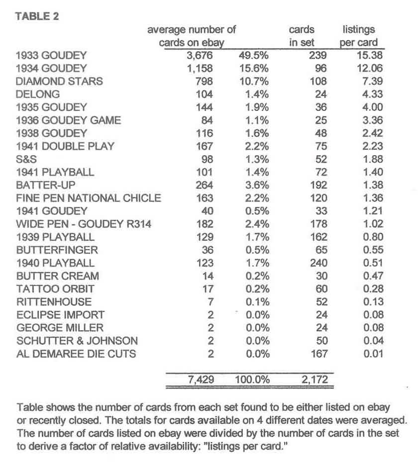 Now that you may have an interest in collecting any of the sets described, a good question would be: What is actually available in the market? A card may well be affordable, desirable, attractive and nostalgic but if it isn’t available in the market, there isn’t much collecting activity. One way to judge availability is to look at what is on ebay. While ebay may have several unusual listings at any point in time, I thought it would give me a general indication of how easy it would be to find some of these cards. I looked at listings on ebay four different times and averaged the results. My research resulted in a big surprise to me. Even though I hadn’t been looking for some of the less popular sets from the era, I thought I would find cards from most sets available on ebay – for a price. Of the sets I have described, 7,429 cards were either currently listed or had sales closed in the past two weeks. The 7,429 represented less than 0.5% of the 1.7 million baseball cards listed on ebay during my survey. Incredibly 1933 Goudeys accounted for 50% of the 7,430 listings with 3,676 cards. 1934 Goudeys had 1,158 listings or 16%, Diamond Stars 798 listings or 11%, and the other sets I’ve discussed had much less activity in total making up 23% of the cards listed. However we really need to look at how many listings there were compared to the number of cards in a set to get a better handle on “availability.” See Table 2 for “listings per card.” Even then, this is still a rough guide in that you certainly won’t run across high numbers as frequently. Also many of the listings, DeLongs for example, include a significant number of ebay store items that are listed for buying now versus for bidding. However using this rough approach Table 2 ranks cards listed on ebay compared to the number of cards in the set.